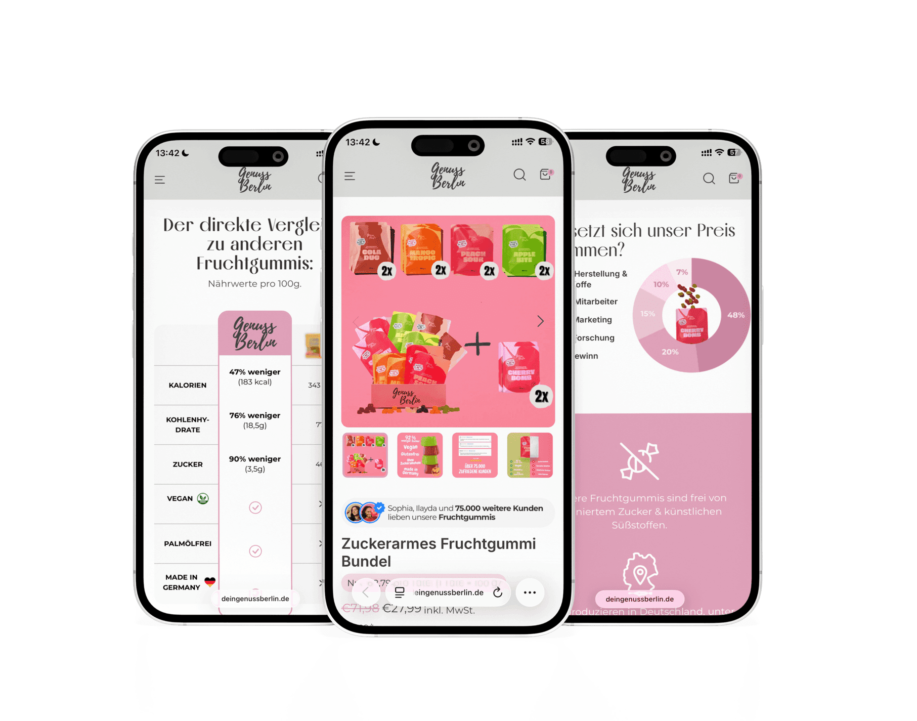 Für die neuen zuckerarmen Fruchtgummies von GenussBerlin wurde eine Salespage entwickelt, um den Traffic besser zu konvertieren.